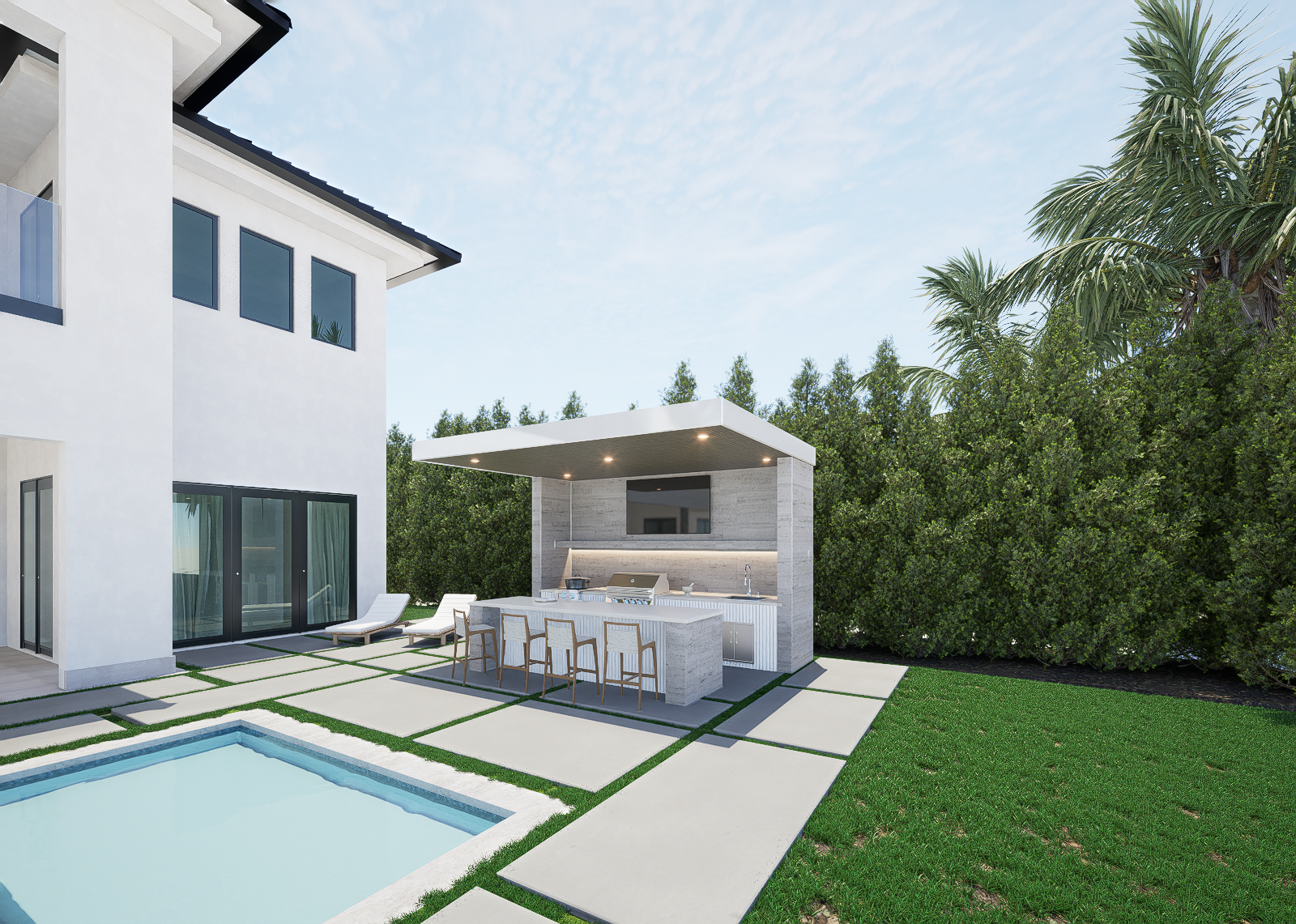 Modern Pergola Retreat: Illuminated Outdoor Living Over Poolside Kitchen & Bar.